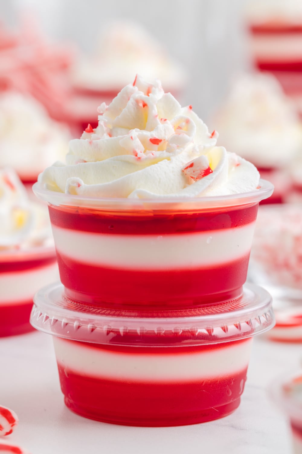 - Before serving, pipe a swirl of whipped cream on top of each jello shot. Sprinkle crushed candy canes or sprinkles on top, and enjoy.