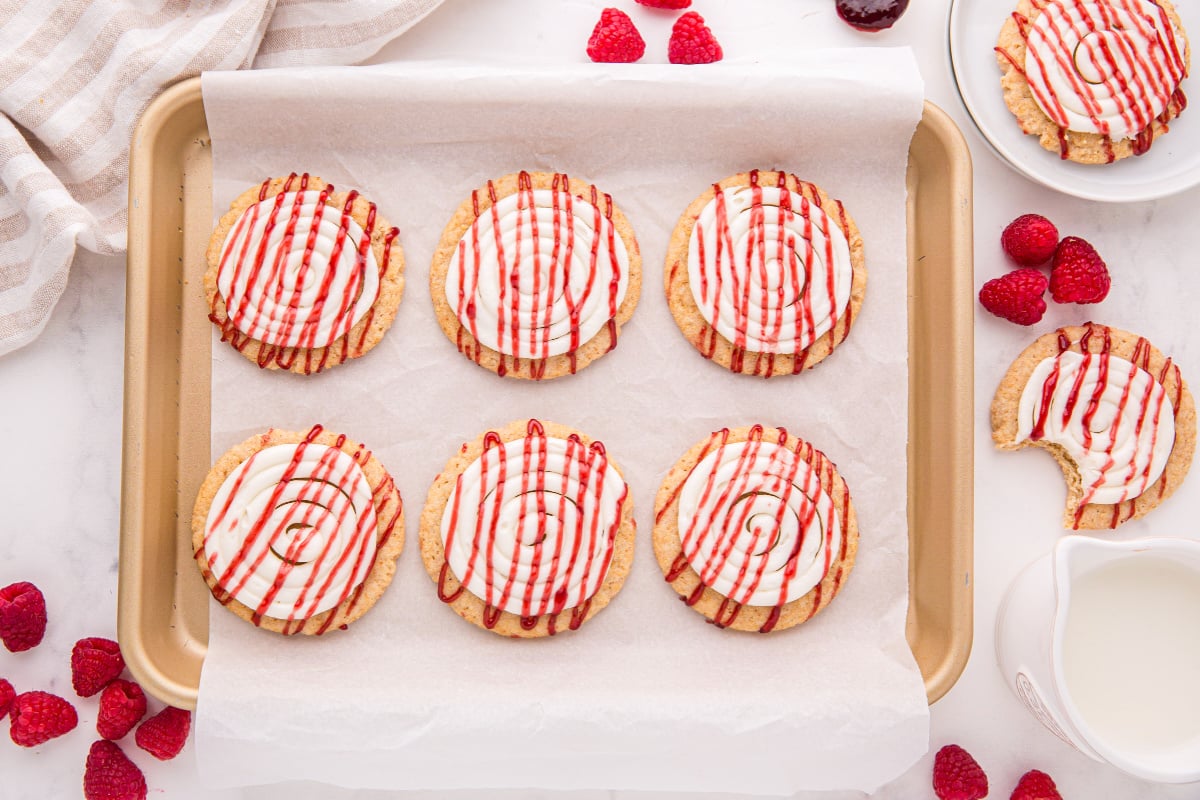 - Drizzle or scoop the cooled raspberry sauce onto each frosted cookie and serve.