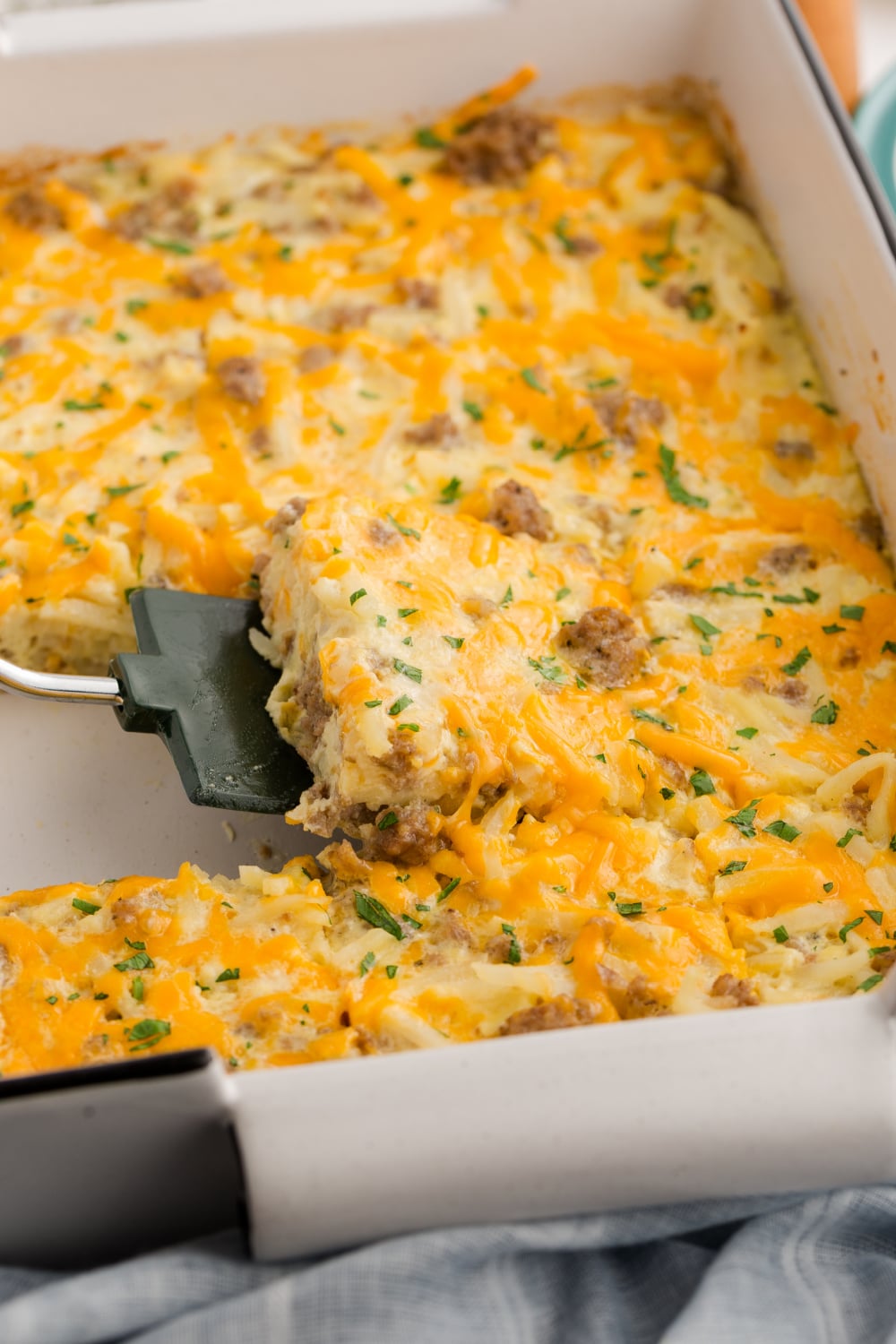 Start your day with a cozy, hearty hashbrown breakfast casserole that’s loaded with eggs, sausage, and lots of cheese. It’s the great thing to serve on a holiday morning, weekend brunch, or the next morning after a busy weeknight dinner. With just minutes of prep, this crowd pleaser bakes up golden and bubbly, filling your kitchen with the best breakfast aroma. Serve it family style or slice it into individual servings. Either way, this whole thing disappears fast.