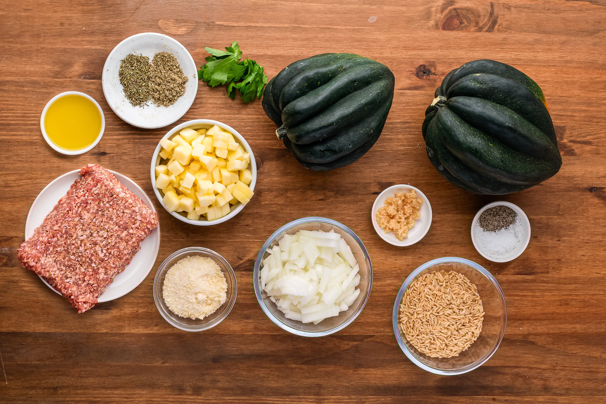 - acorn squash: Naturally sweet base that develops a deep, nutty flavor as the cut sides roast.