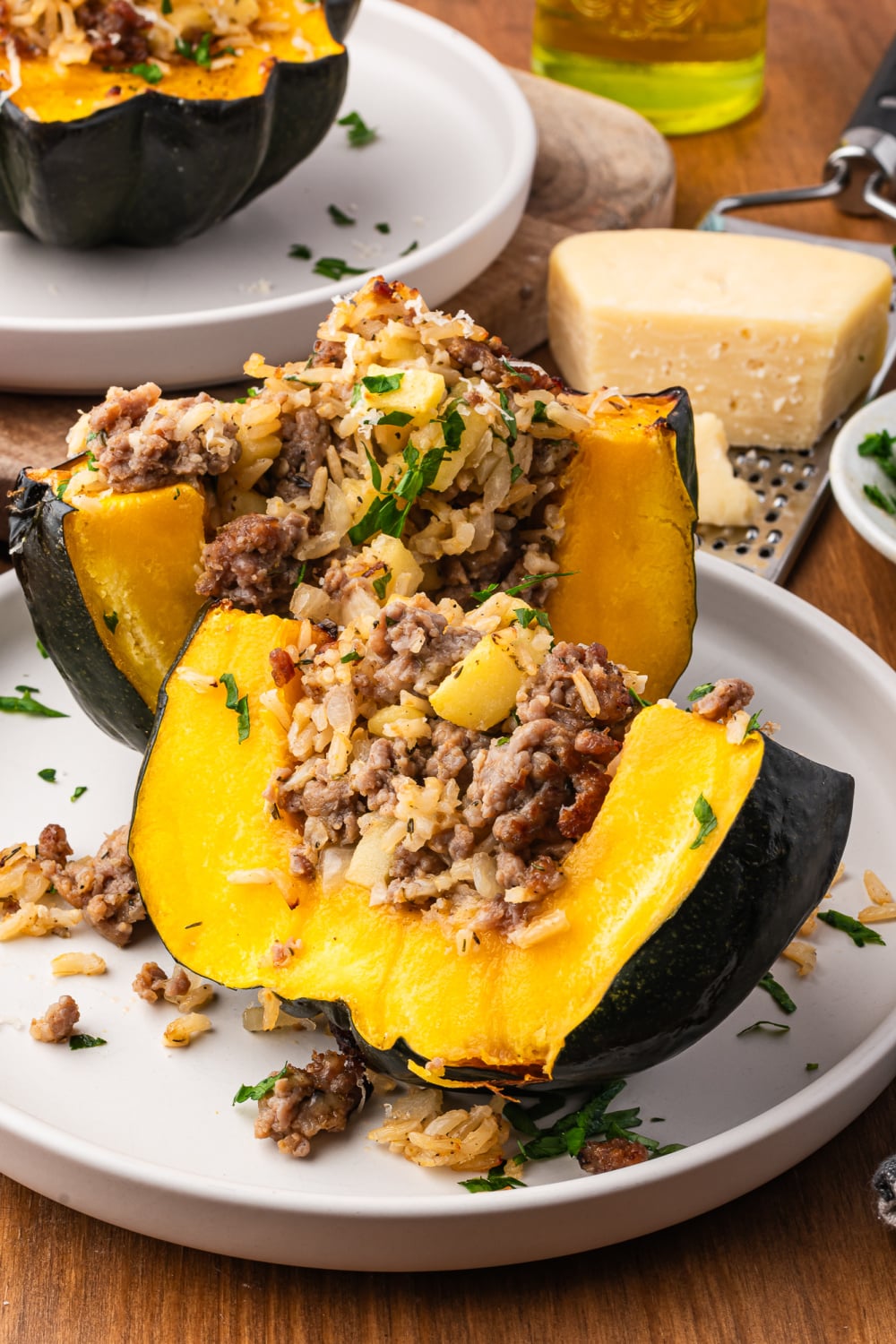 - Turn the heat off and fold in the brown rice and Parmesan cheese. Fill each squash half with the sausage mixture. You can lightly pack it down to fit more in, using up the filling.