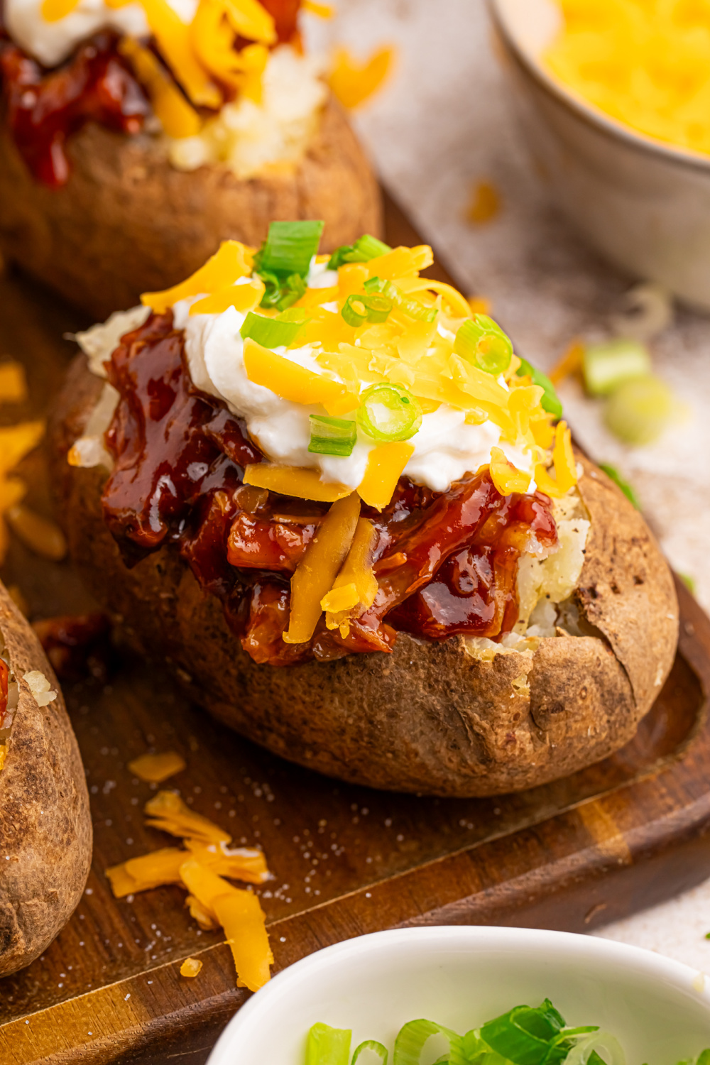 - Slice each potato open and fluff the insides with a fork. Top with warm BBQ chicken, shredded cheddar, a dollop of sour cream, green onions, and any other toppings you like. Enjoy!